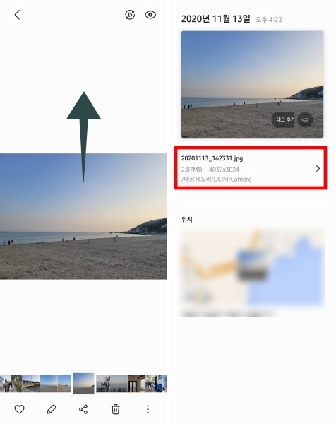 갤럭시 갤러리 앱을 실행합니다. 그리고 위치정보를 삭제하고 싶은 사진을 선택한 뒤에 사진을 위로 쓸어올려봅니다. 그러면 사진의 용량 및 해상도 정보가 뜨고 그 아래에 위치가 지도로 표시되는 것을 알 수 있습니다. 사진위치 삭제 방법은 파일명을 눌러봅니다.
