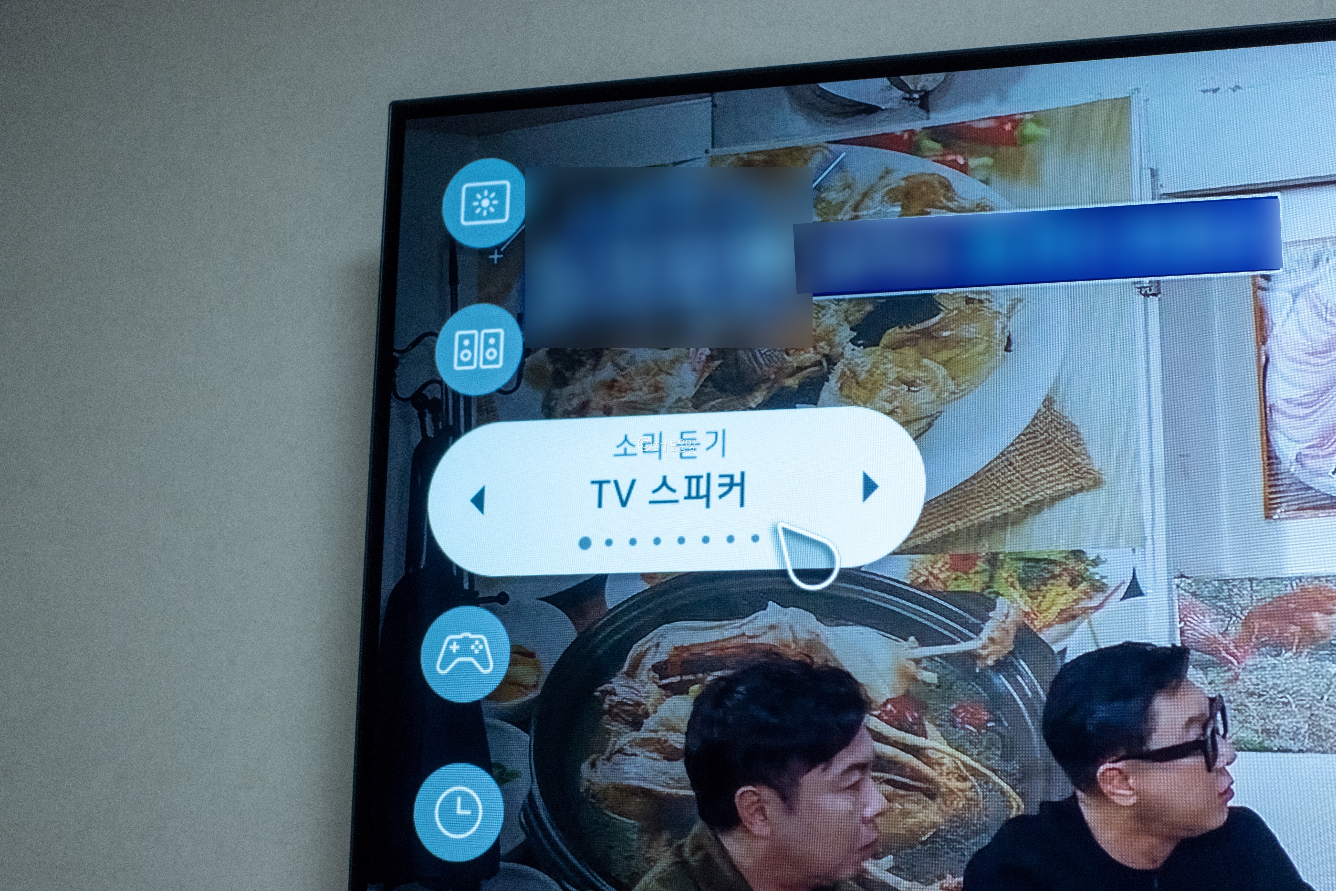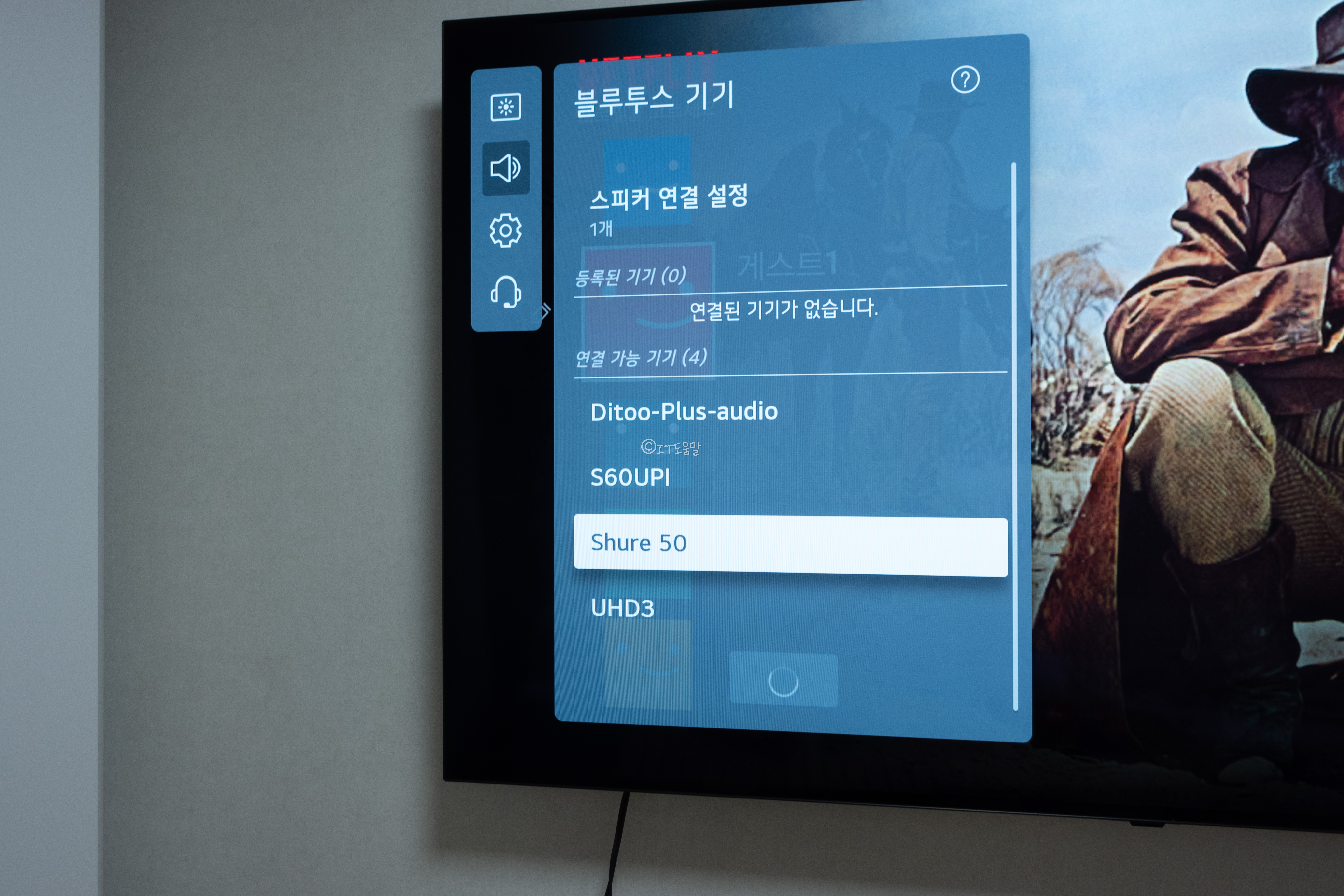 다시 설명하면 왼쪽 사이드메뉴에서 소리 듣기를 리모콘 마우스로 커서를 옮겨서 눌러주도록 합니다. 기본은 TV 스피커로 설정되어있을 것인데, 이것을 눌러서 블루투스 기기로 바꿔준 다음에 기기목록을 선택합니다.