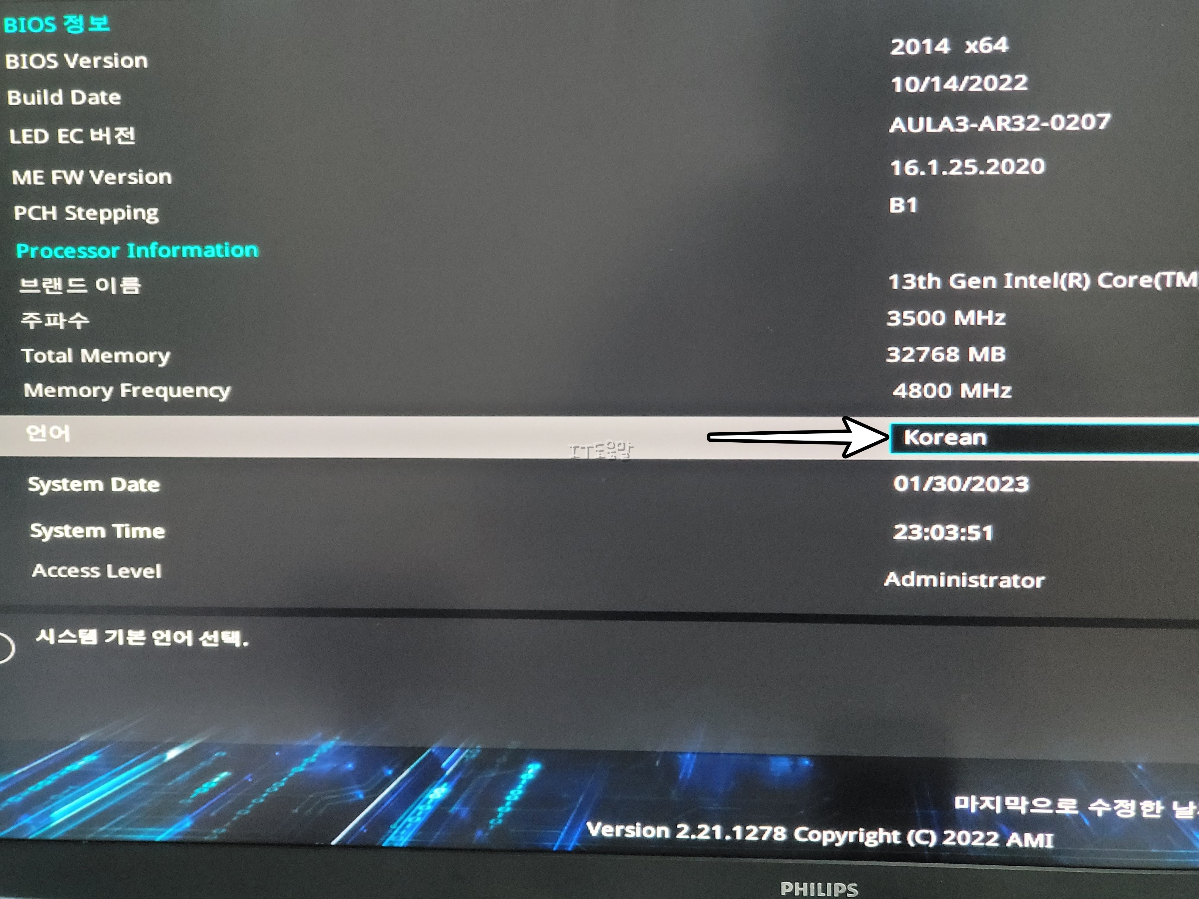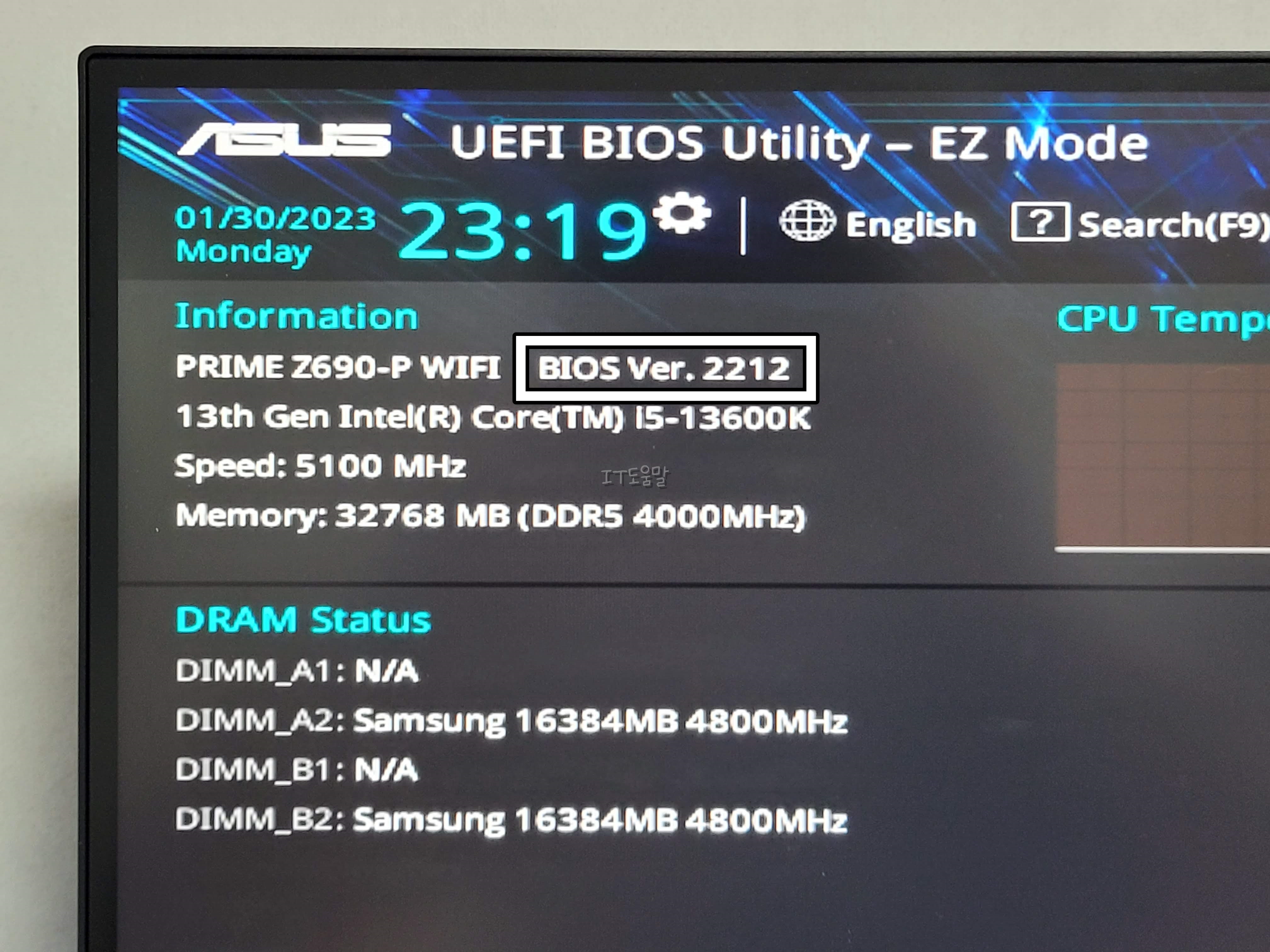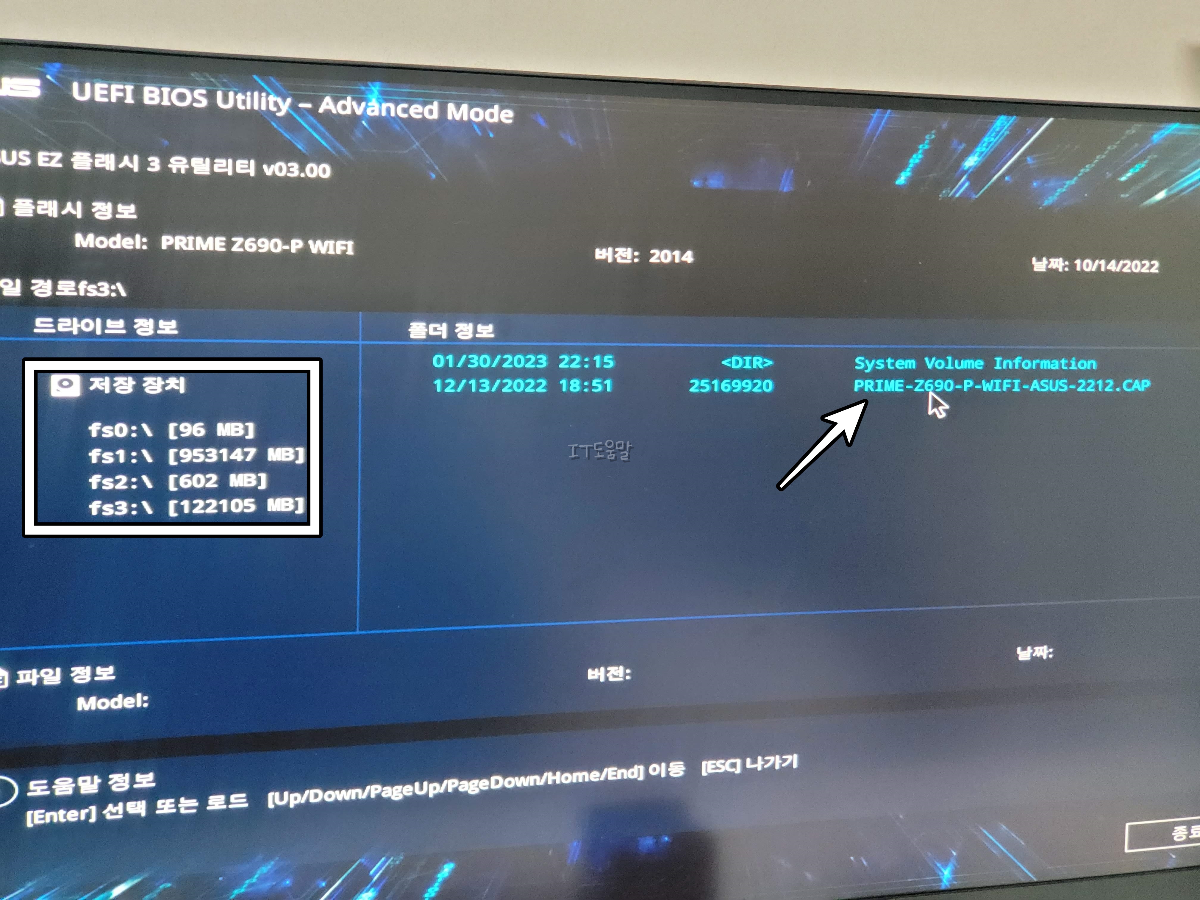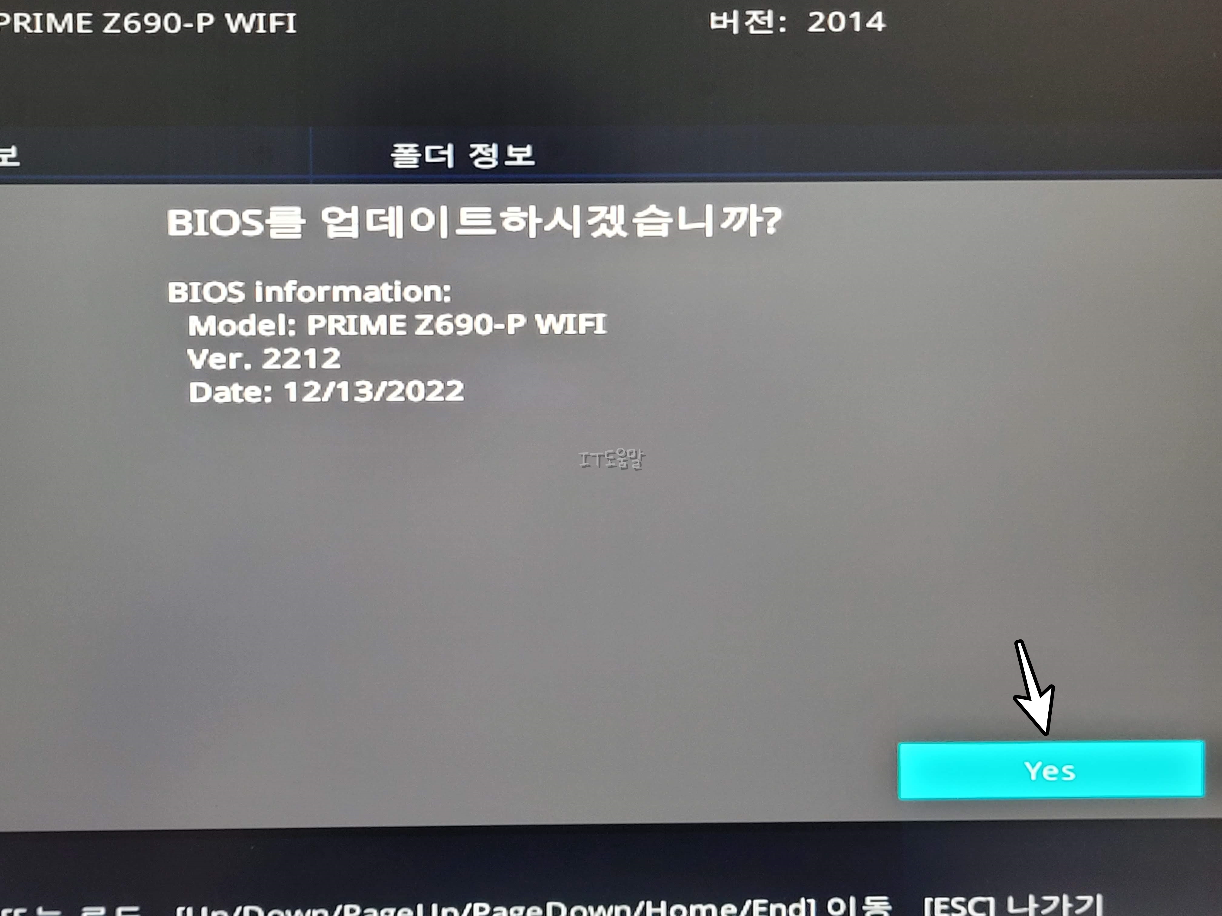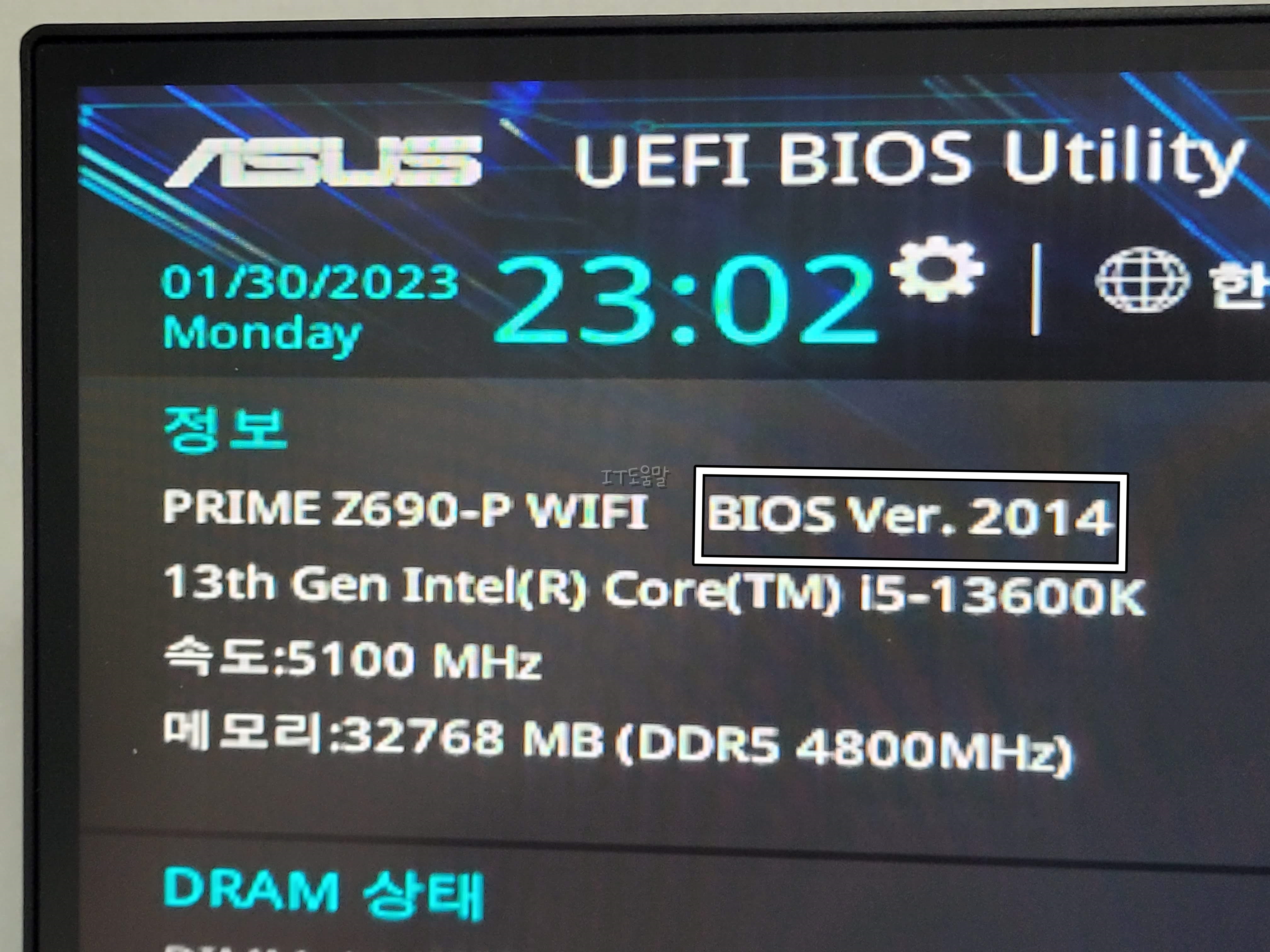 예를 들어서 저는 ASUS PRIME Z690-P WIFI 보드를 사용중이며, BIOS 버전은 2014입니다. 인텔 13세대 CPU 및 DDR5 RAM을사용하기 위해서 선택한 것이긴 한데, 버전을 올려보겠습니다.