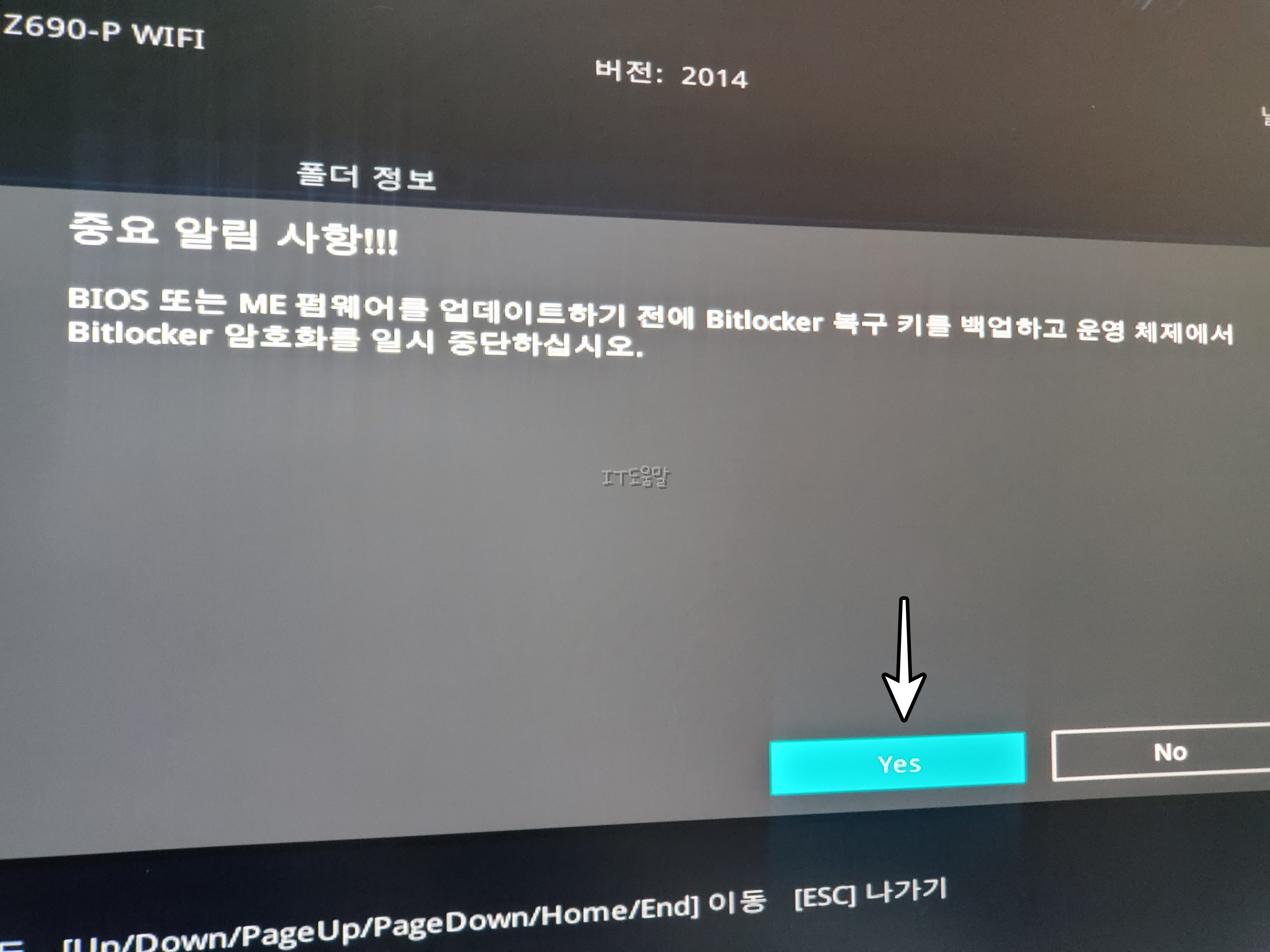BIOS 또는 ME 펌웨어 업데이트 하기전에는 비트락커 암호화를 일시 중단하라는 안내가 나옵니다. 안걸려있으면 YES를 클릭해서 넘어가고, 바이오스 업데이트를 시작합니다.