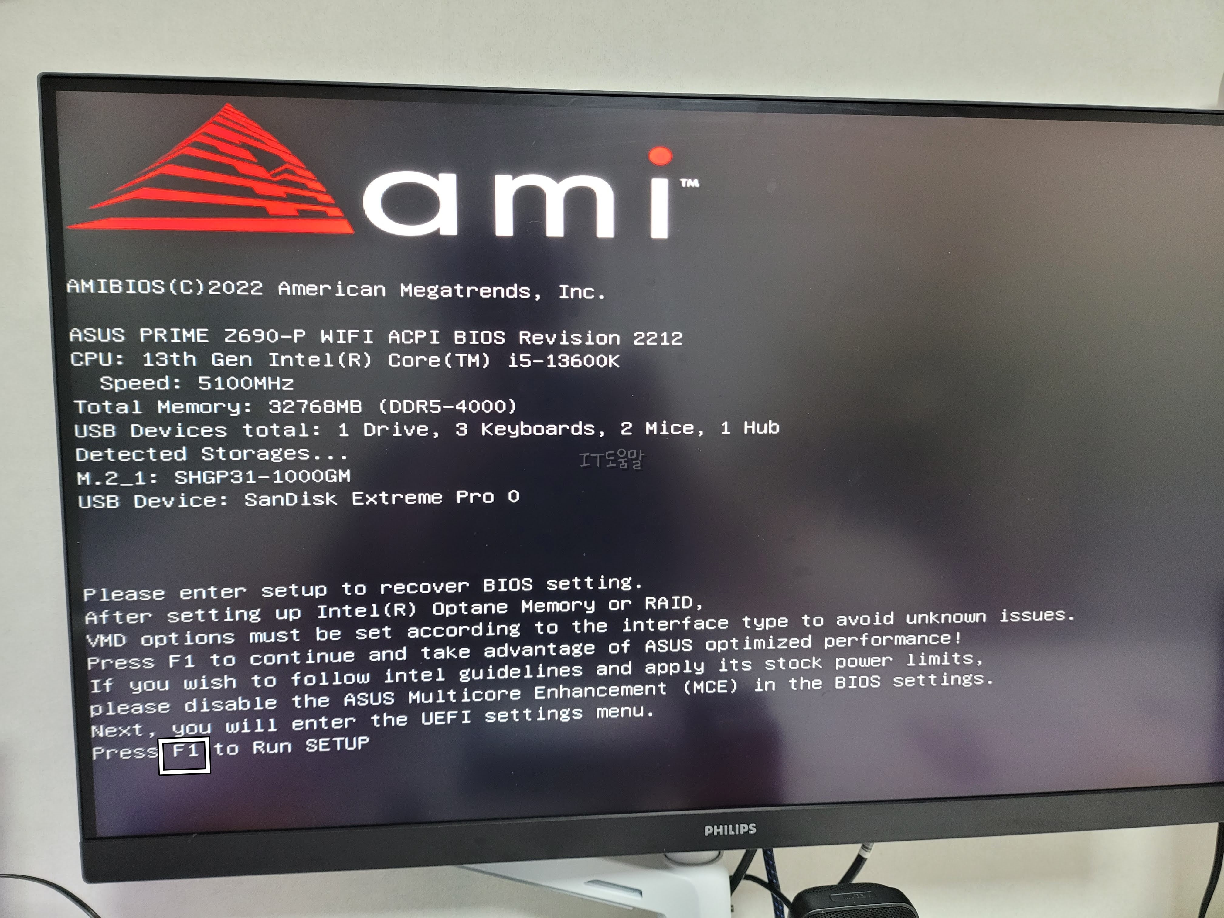 최신 메인보드 드라이버 업데이트가 완료된 뒤에 이런 오류가 뜨더군요. 잘은 모르겠지만 옵테인 또는 RAID 설정이 안되어있다는 소리이므로, 당황하지말고 어쨋든 F1를 눌러서 넘어가면 됩니다.