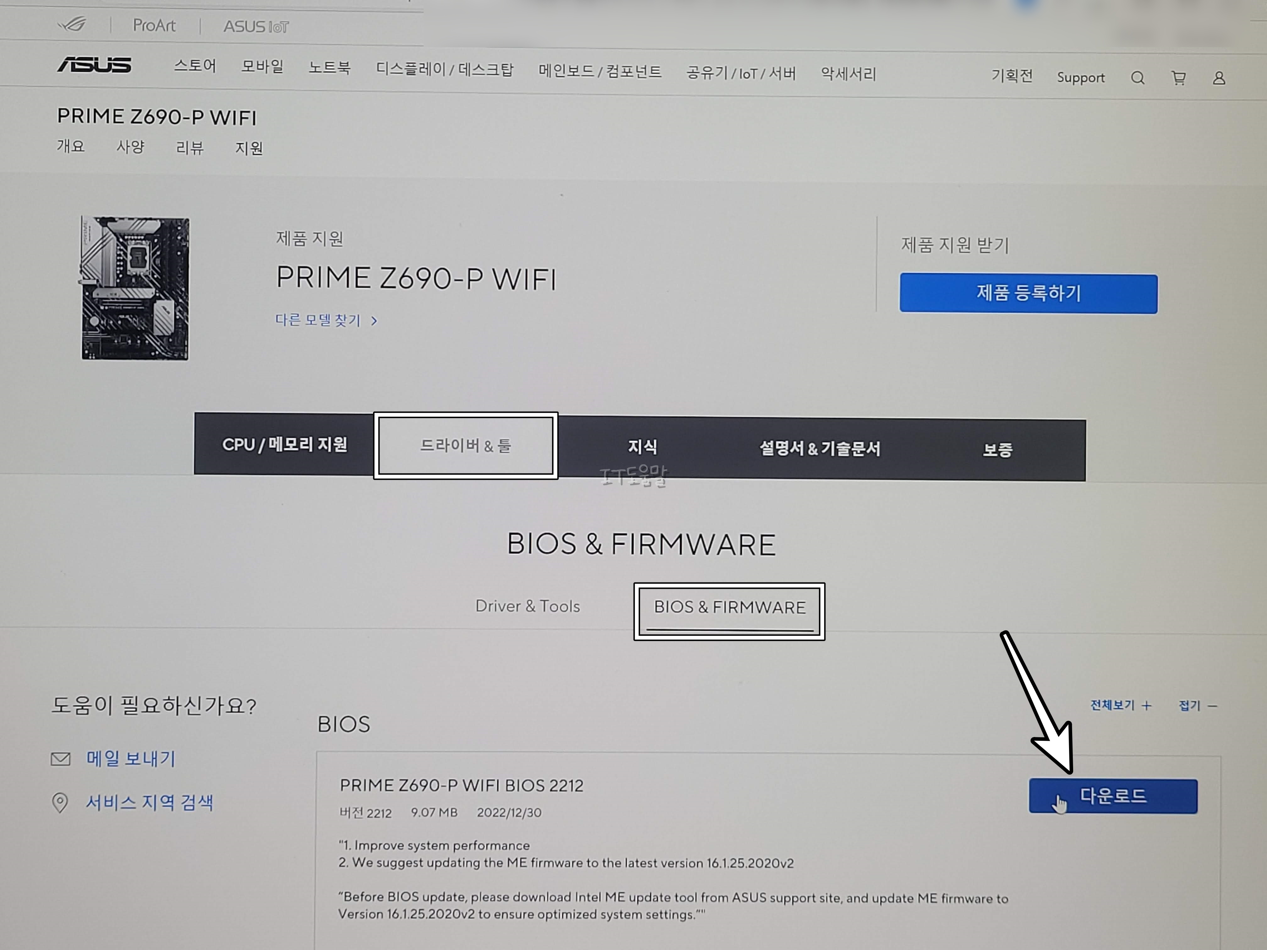 그리고, 드라이버 & 툴 탭이 뜨면 BIOS & FIRMWARE 탭을 클릭해서 최신 바이오스 파일을 다운로드 하도록 합니다.