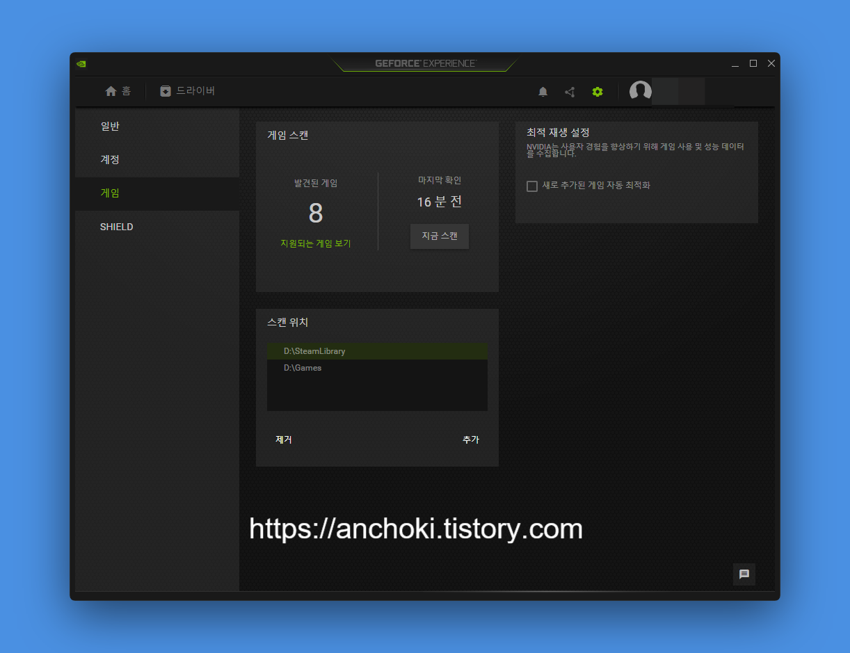 라이브러리 목록은 컴퓨터 지포스 익스프리언스 프로그램 설정에서 게임 탭에 있는 게임 스캔 위치를 추가하여 더 많은 게임을 추가시킬 수 있다.