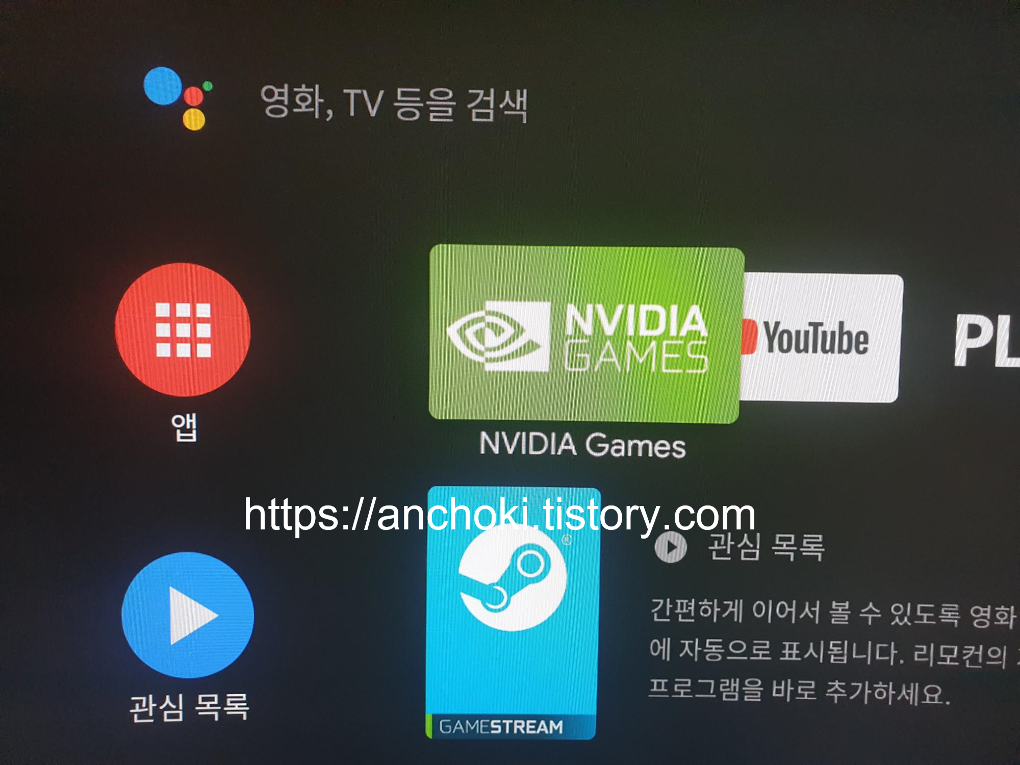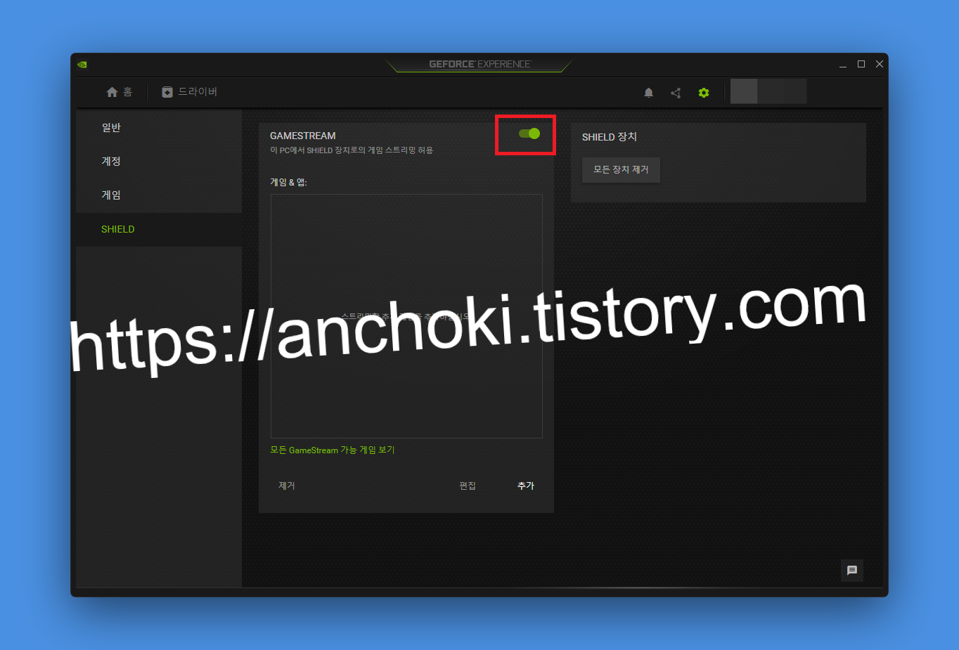 쉴드TV에서 NVIDIA Games에 들어간다. 몇 가지 설정해줘야 될 사항들이 있다.